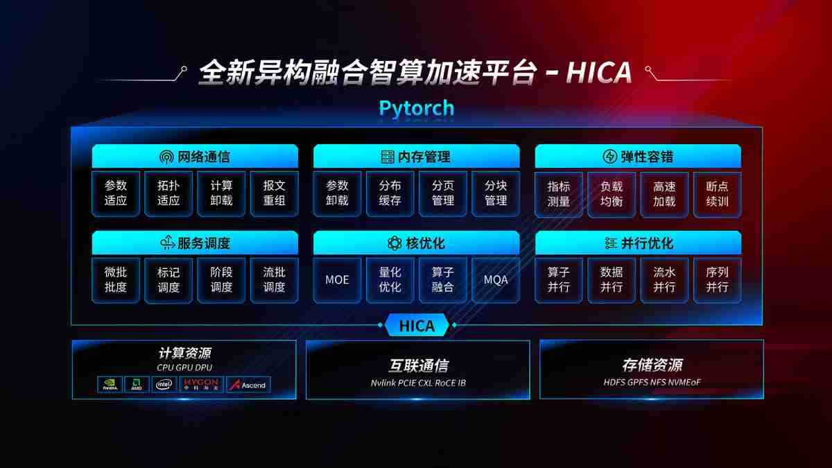 通过自研的服务层、、、、中间适配层、、、以及调度编排算法,,采用数据并行、、、模型并行等多种并行方式,,,把并行计算任务进行有效的分解,,使其分别由相应的软件栈和算力资源来承接。。当GPU资源变化,,,,HICA可以实时动态调度计算子任务并调整模型拓扑和架构,,,以充分聚合各种算力资源。。。。