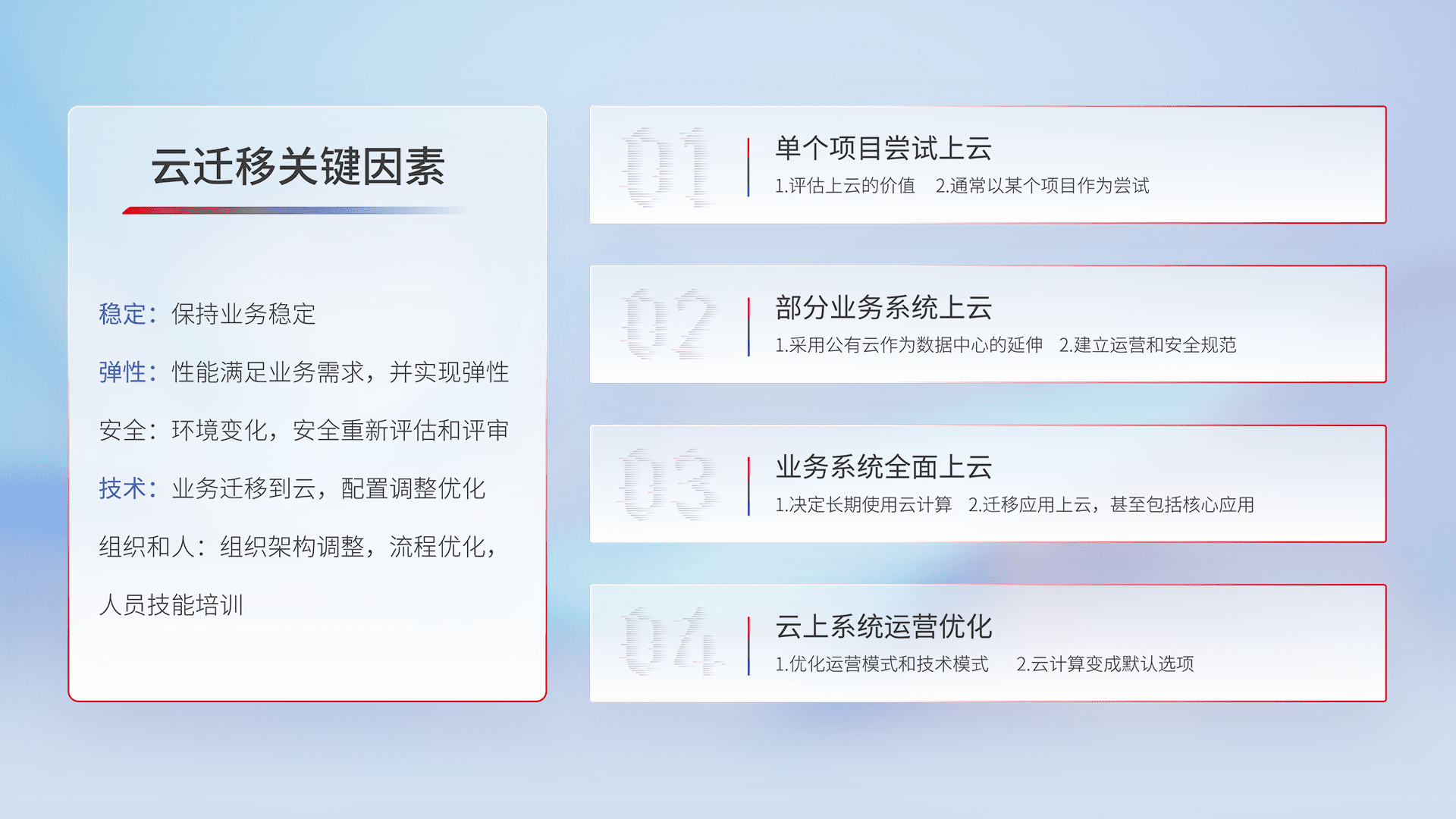 结合实际业务,,从规划设计、、、、云平台选型、、、、云原生改造、、、、数据迁移、、、集成交付,,,迁移全过程为客户识别最佳上云路径,,,做好风险识别管理,,,设计网络架构、、、、身份权限、、、安全审计合规、、、操作审计、、、日志审计、、监控告警策略、、、、多站点容灾设计等,,对云上基础设施进行整体规划,,,,提升IT治理水平,,以满足弹性、、高可用、、、高性能的需求。。。
