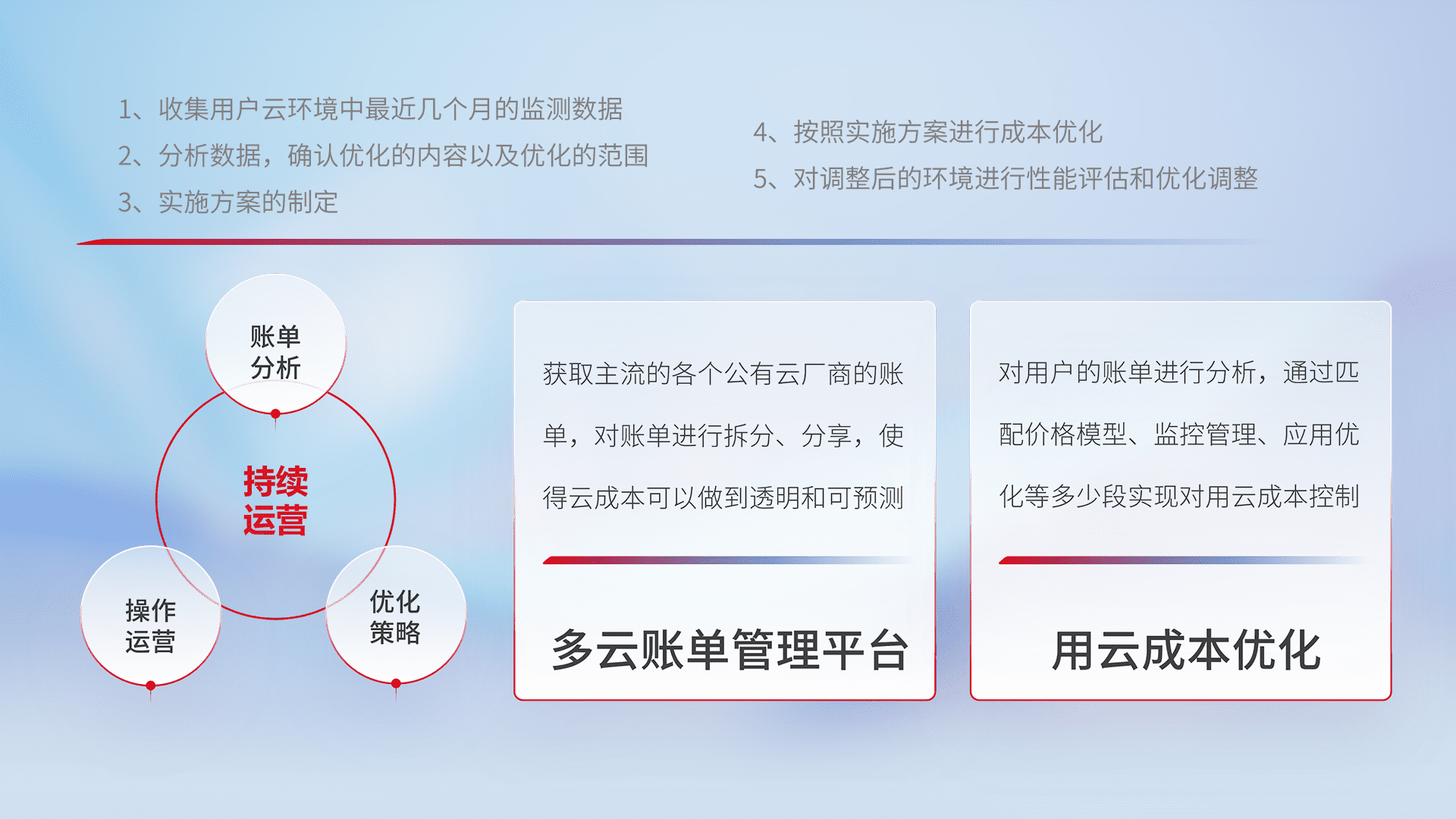 通过多云纳管,,,以统一的资源数据模型把客户的云资源进行抽象和封装,,,,进而实现对多云资源的统一操作,,保障云资源管理的可靠性、、稳定性与可用性。。量身定制化运维内容,,,,配置、、、、开发运维、、补丁管理、、备份、、、监控、、、认证和访问管理、、审计和日常巡检等,,保障在用云过程中的可靠度,,,,稳定度以及高可用率。。。