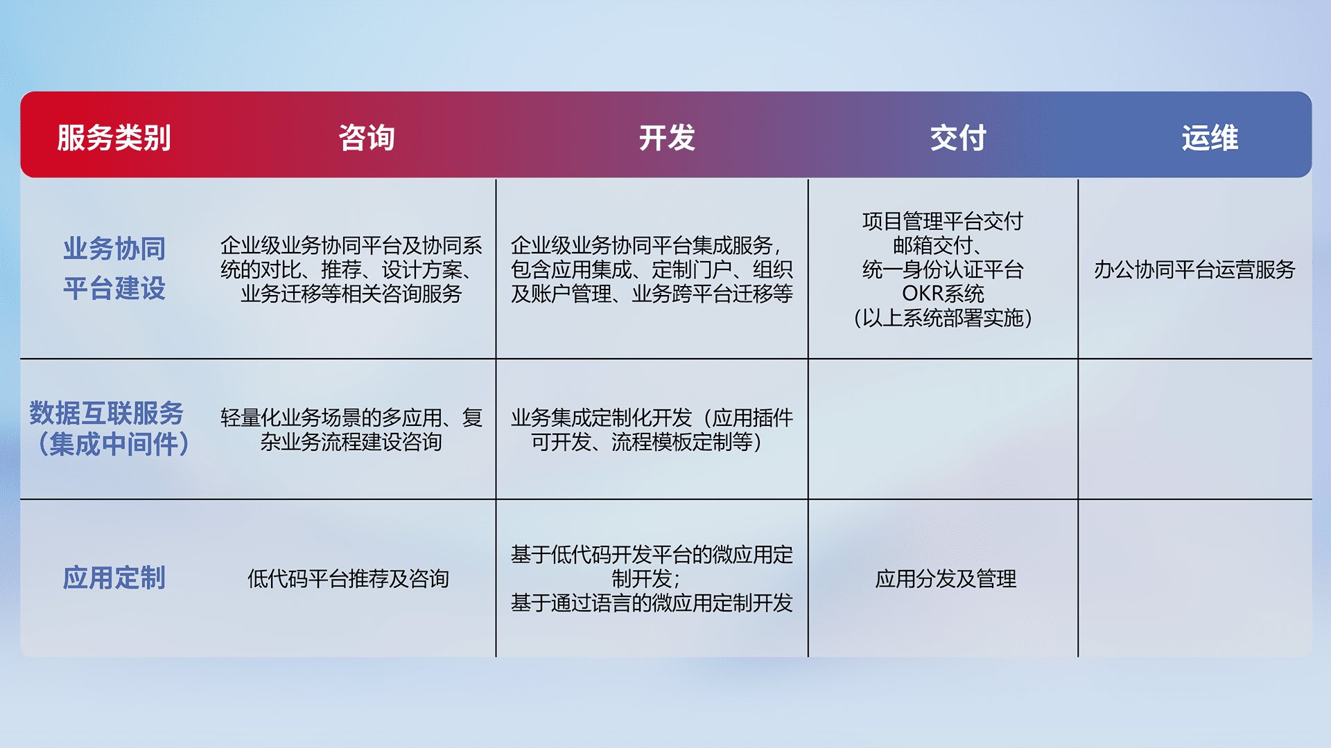 针对钉钉、、、、企微、、、、IDaas等平台级产品提供产品的规划、、方案、、交付、、、、定制化开发等服务,,,实现如统一协同办公、、、智能客户服务、、混合会议管理、、智能数据查询、、、、等业务场景,,,实现数字化转型。。。